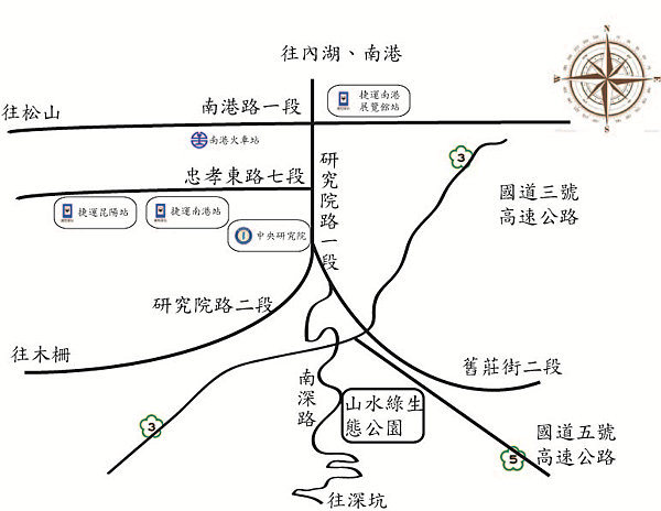 高速公路路線指引:國道3號北上中央研究院匝道出口,下交流道後直行南深路約1.5公里抵達公園入口