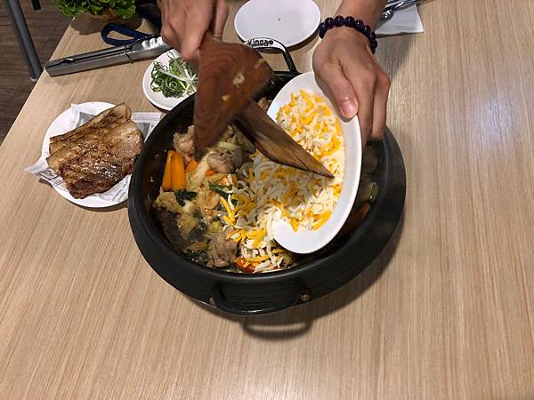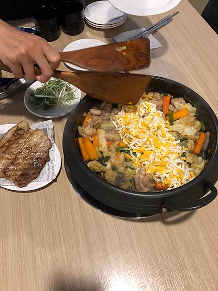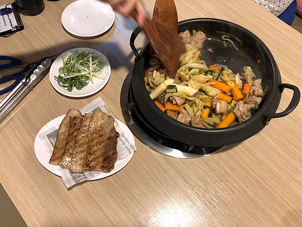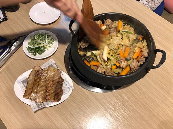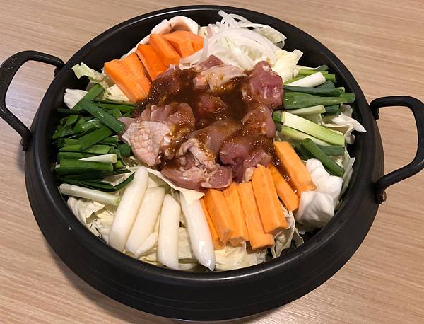 鑄鐵鍋裡放入高麗菜打底、上面的食材有紅蘿蔔、洋蔥、蔥、年糕及雞肉,因為我不吃辣所以醬料是老闆自製的不辣醬