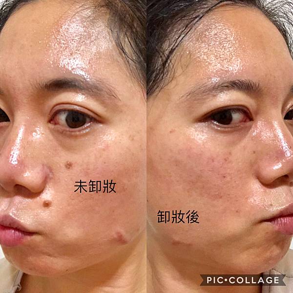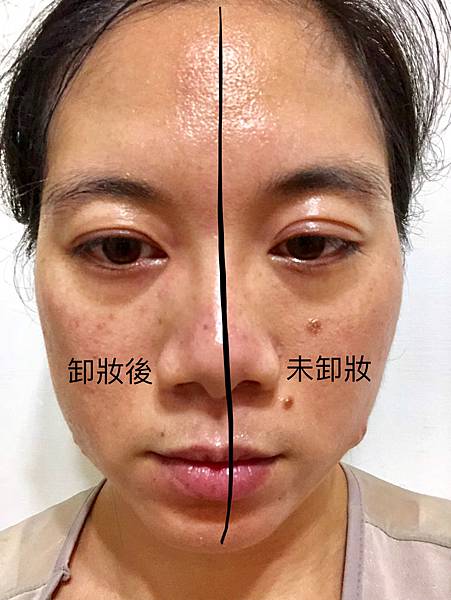 卸後臉乾淨不油膩也不緊繃,臉是有光澤的。另一半帶有髒污還有微泛紅與油膩。