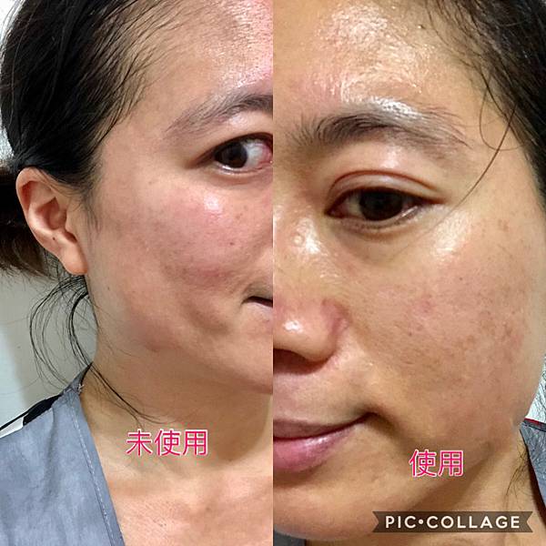 使用的那邊臉臉上看起來濕濕潤潤的,而且也光亮,毛孔也因為保水而縮小了,泛紅的地方也不泛紅了,還可以修復過敏,而且搭配按摩手法臉也看起來比較瘦嘴唇也比較沒這麼下垂了,順便還可以拉提