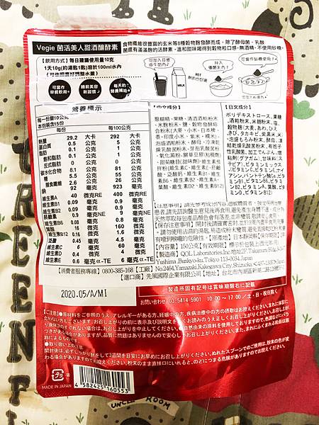 成分有:麴箘、酵母菌、乳酸菌,再加上11種維他命,膳食纖維3000mg,不使用砂糖以及人甘味料,無酒精。
