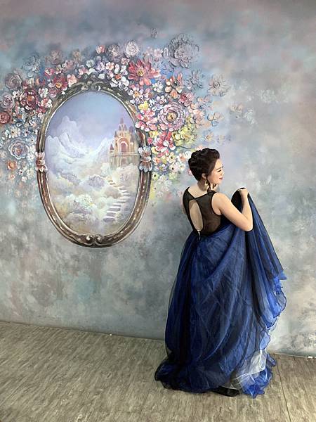 我又請老師用手機在這面牆先幫我搭配禮服與妝髮先拍一下,這面牆穿禮服拍也很漂亮捏!