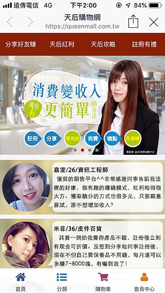 天后購物網的首頁,一用手機點進去斗大的標題就是消費變收入,現在有更簡單的方法,下面很多網路紅人不只介紹網站還介紹如何變美又賺錢。