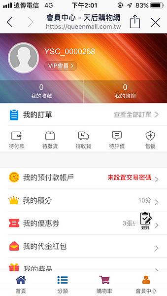 這個是天后購物網註冊完後的畫面,可以查詢自己的訂購還有紅利金之類的地方,然後會送妳一些優惠卷。
