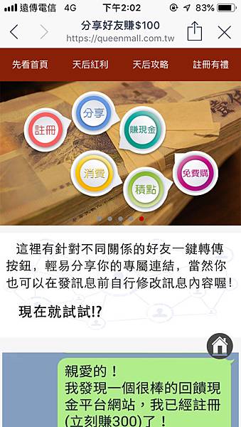 再來就來介紹小資女更想得知的兩大功能,天后購物網提供可以讓我們賺錢的功能,第一個就是分享好友讓好友也得知天后購物網這個優質的保養品網站買到品質好的保養品,就可以賺取紅利金。分享就賺錢這不是很棒嗎?
