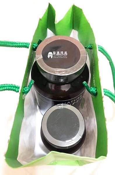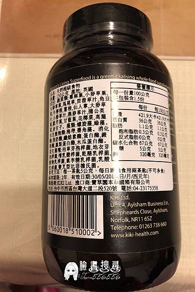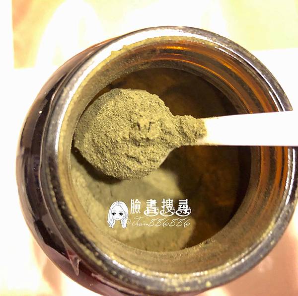 綠色鹼性保健品,產品內包括海帶、微藻、酶和人工培養箘,精選32種主要成分經冷壓處理。