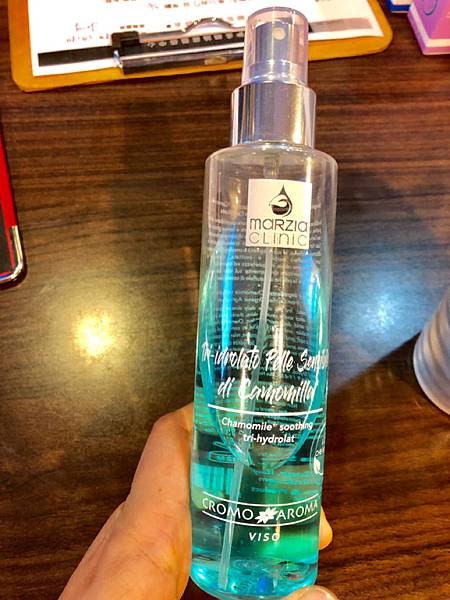 因為這正是我的肌膚狀態,剛做完專業面洗,臉部有泛紅,美容師馬上就用洋甘菊三重露幫我做濕敷舒緩的動作。