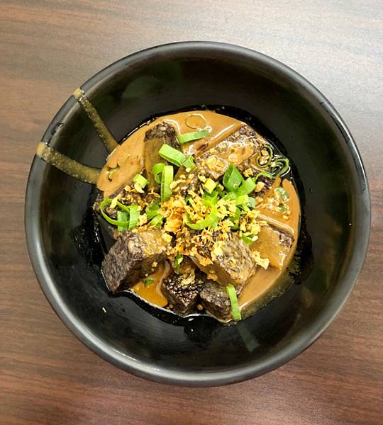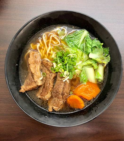 這個是牛肉麵,牛肉麵先上來,我跟媽媽一人吃一半,牛肉很多又大塊,整整5塊欸!才賣130元,而且老闆還擔心牛肉到的晚,牛肉還沒煮透,但是我跟媽媽都覺得牛肉已經滷入味了,而且很好吃,不會太韌也不會太軟,牛肉湯不油不膩,味道也恰到好處,紅蘿蔔也不會太老或太嫩,這碗牛肉麵深得我跟媽媽的胃。