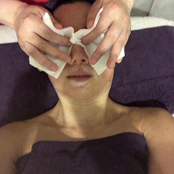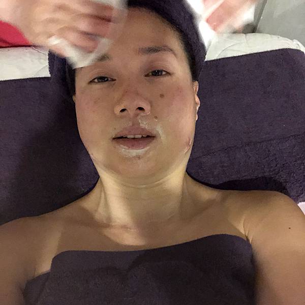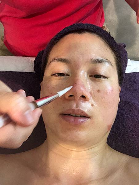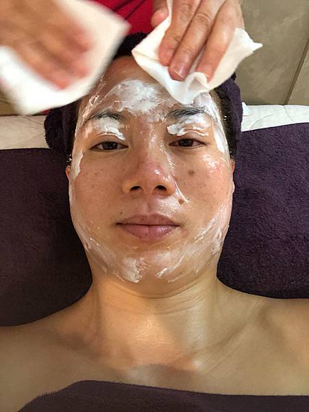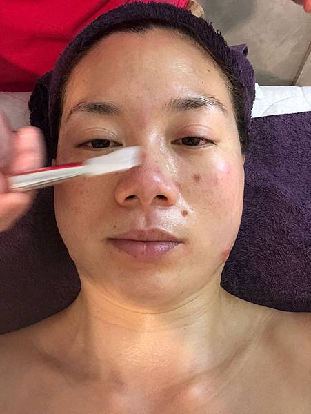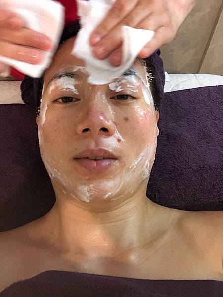 再來美容師第二步驟是幫客人去角質,美容師說我的膚質屬於敏感肌膚,不能使用顆粒狀的去角質,所以幫我使用日本進口非顆粒狀的去角質,因為如果我使用顆粒狀的去角質,過敏會更嚴重,也會告訴客人膚質屬於哪種要用哪種去角質產品。超貼心!