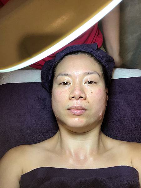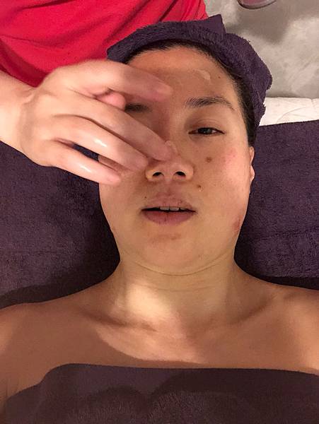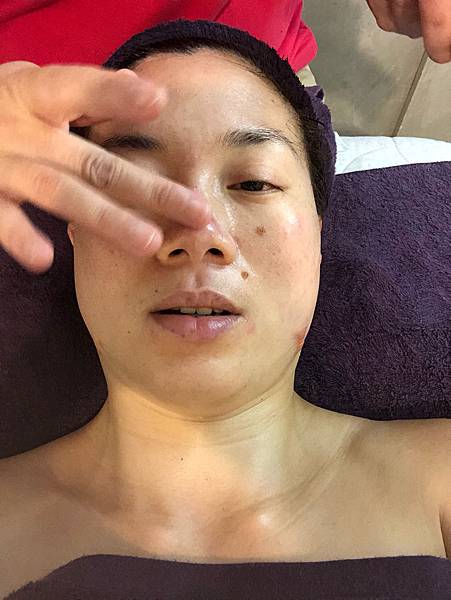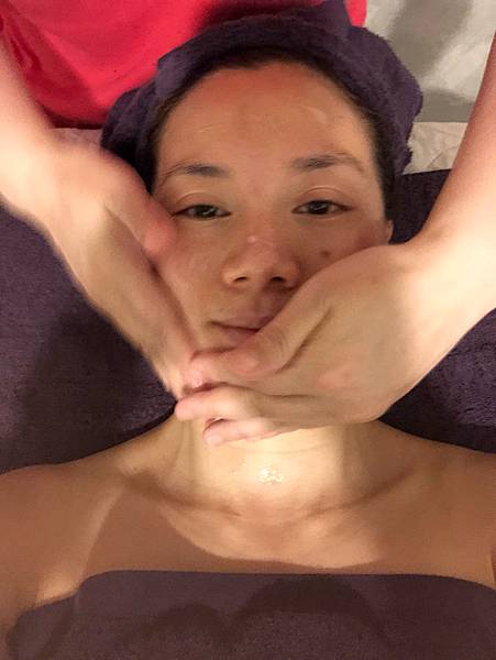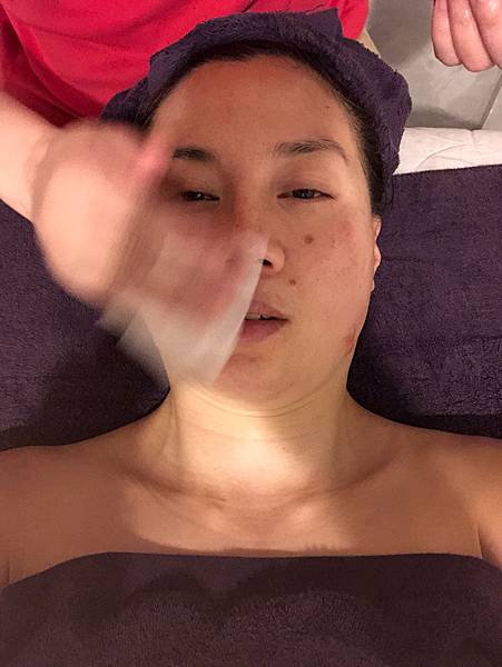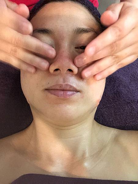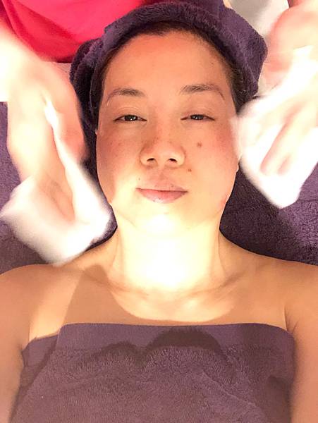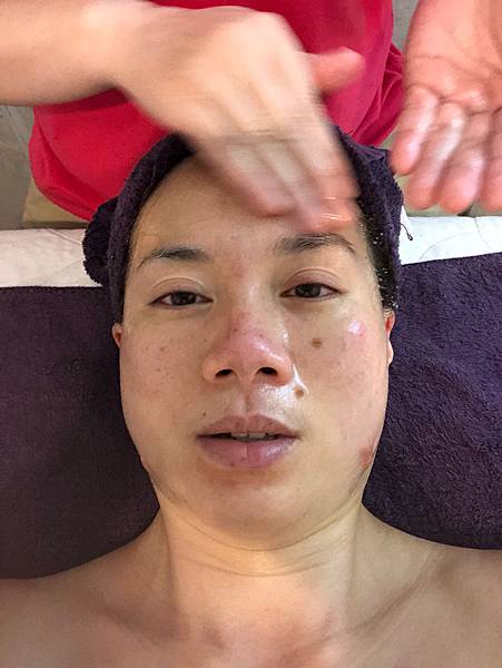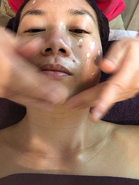 美容師還會利用筋絡按摩的手法幫妳臉部做按摩,但美容師有說這個產品在按摩時會產生熱,這個熱會因為按摩而舒緩臉部緊繃的狀態,敏感肌因為敏感所以不能按摩太久,所以我也享受溫熱感與美容師的手勁,讓我一邊按摩一邊超想睡覺,手技超好的。