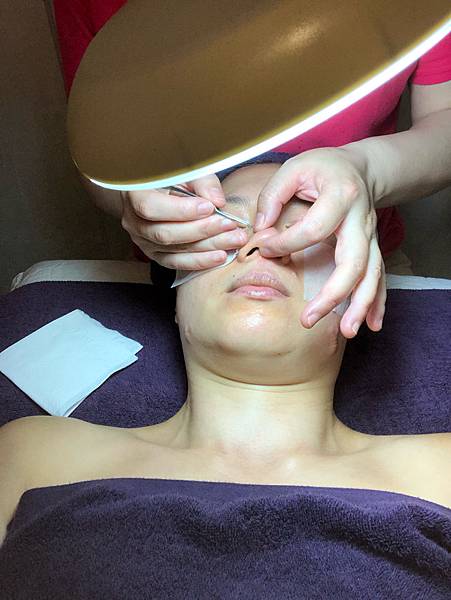 美容師在清理粉刺之前會造燈,讓燈光看清楚,客人的臉上粉刺多少,美容師說敏感肌的粉刺都比較少,而且都集中在鼻子與T字部位,而且敏感肌在清粉刺軟化角質的時候不能用蒸的,只能用日本深層舒緩保濕純露濕敷。
