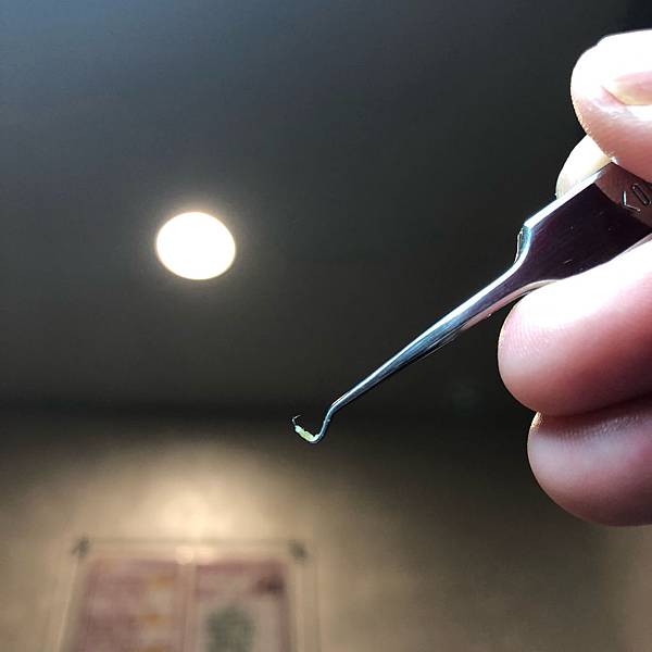 美容師在幫我清理鼻頭粉刺時有跟我說,不管怎樣的清理都會刺痛,要稍微忍耐一下,但還好我感受不深不太痛,然後美容師又說,敏感肌的粉刺都是又乾又細,所以要仔細看夾子上的粉刺,那是我的粉刺,是不是真的很小很細捏!