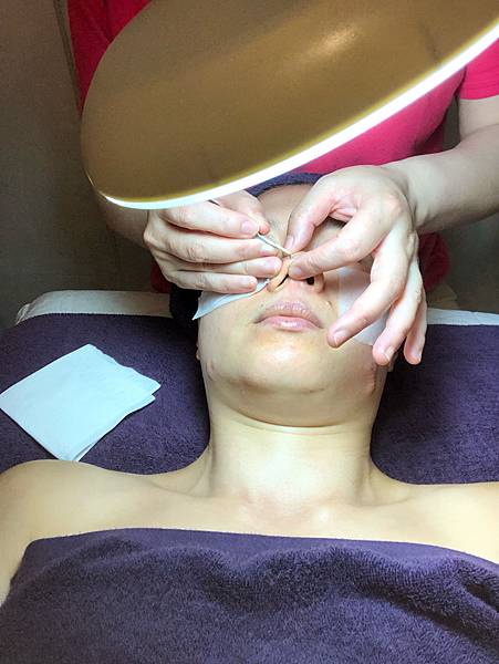 再幫妳敷鼻翼,再把額頭上的拿下,先清理粉刺,但因為額頭的粉刺很少所以很快就清好了,我的粉刺都集中在鼻子上。