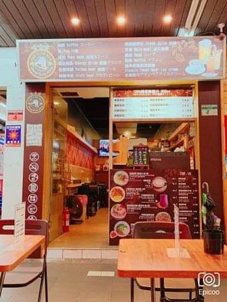 大門是棕色的!裡面空間雖小,但是東西都有,外面還有座位區。