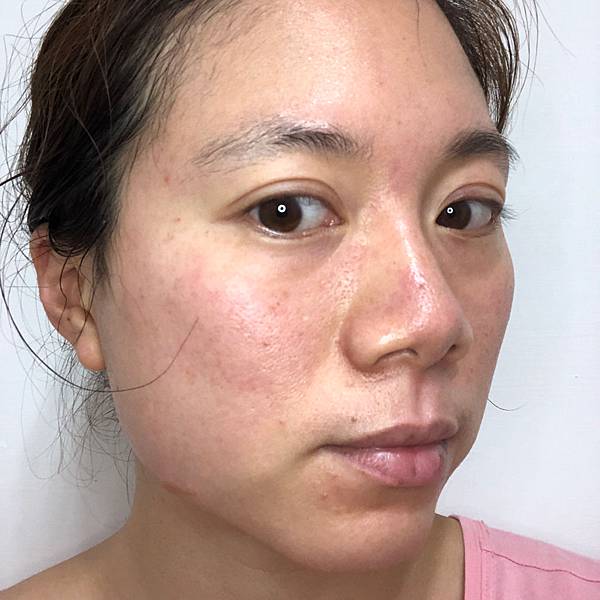 局部敷完的感覺,兩頰都澎上來了,而且明顯的白很多,而且也舒緩了泛紅區,整半張臉都水潤的。