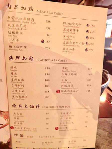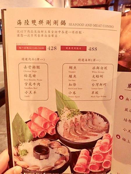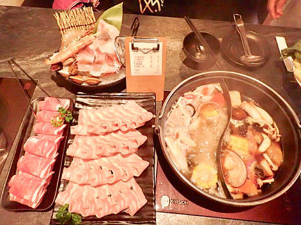 主餐的海鮮有魚片,魚片在火鍋裡煮原味吃的到鮮味,而且沒有魚味,入口即化,還有小管,小管很好咬,不會像橡皮筋,也吃的出他的鮮味,還有蝦子,蝦子也很新鮮跟甜美,在搭配羊肉,羊肉很嫩,沒有羊騷味,肉質很甜,稍微涮一下即可品嘗到新鮮的肉,重點是不管是羊肉還是松阪豬,都入口即化,蛤仔也很新鮮跟肥美,很少吃到這麼大顆的蛤仔。