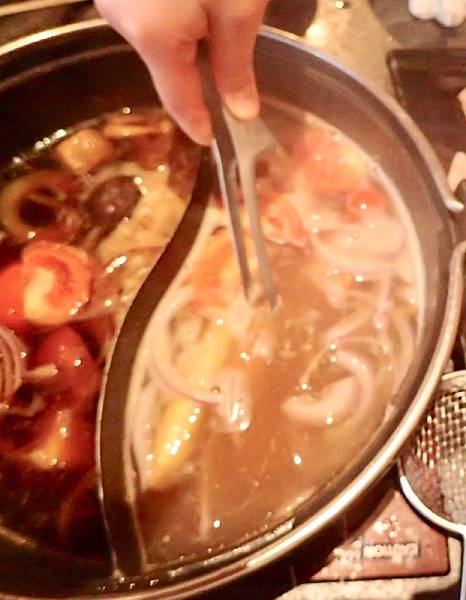 好嚕!來介紹重頭戲啦!火鍋的湯頭,我們點了一個昆布湯與壽喜燒湯。