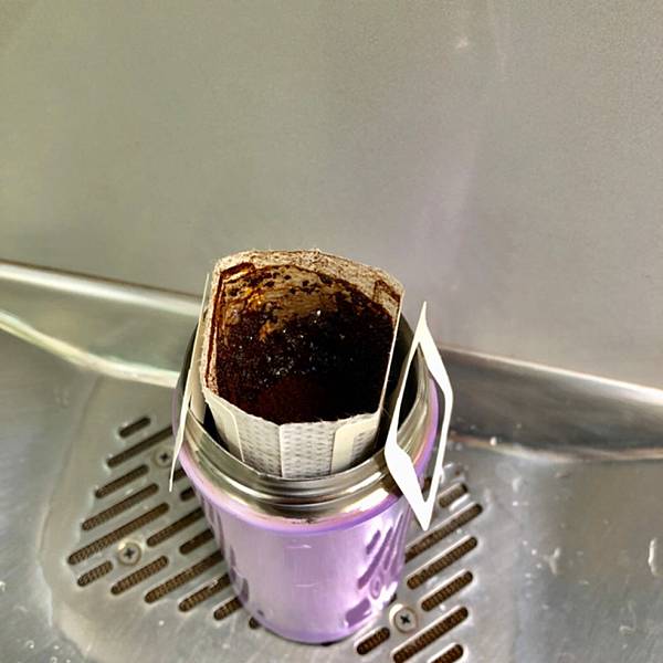 我這次無法設定水溫,因為只能用台北市立美術館的飲水機泡,所以水溫很高,打開來把它放在保溫杯上要沖泡時,咖啡味真的撲鼻而來,好香唷!