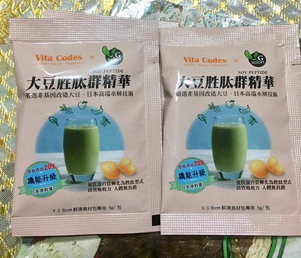 把V.G BOOM嚴選的鮮凍包拿出來倒入果汁機裡,在把大豆胜肽包倒入果汁機裡,最後加入水或豆漿打成精力湯。