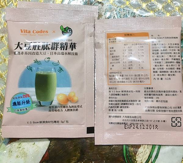 這杯V.G BOOM鮮凍食材包打出的綠拿鐵,蔬果的纖維都喝得到,而且健康滿分,自己打的新鮮度看得到而且也不會被迫加糖,蔬果的原味與甜味都在這一杯裡,這就是我最愛的綠拿鐵,還加上大豆胜肽精華,讓妳更健康。