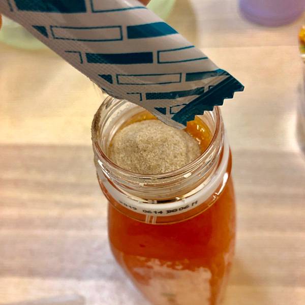 一小包撕開就可以直接往杯子倒,粉末是有點梅子色的,粉末可以搭配200-250cc的常溫開水泡。