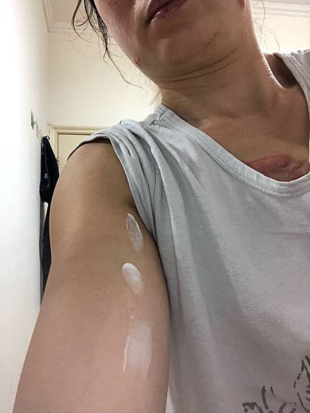 這是使用第四天的手臂特寫,我覺得肌膚水嫩,亮白,而且塗抹的前胸,水潤亮白。