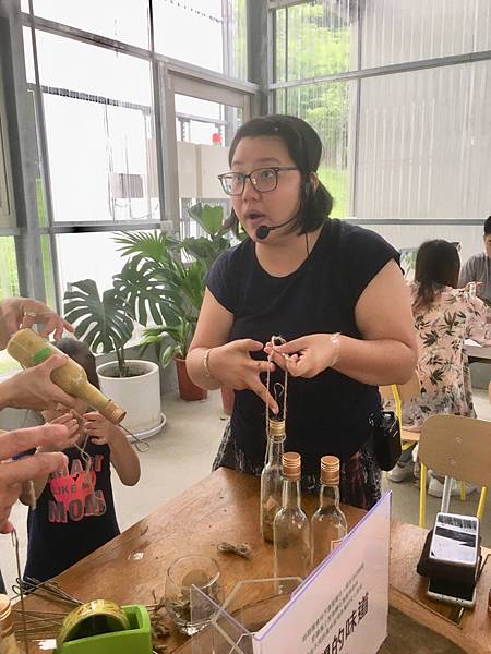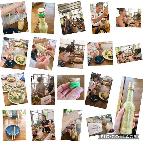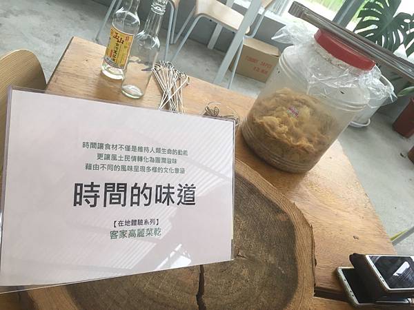 我們欣賞完我們的住宿後,下午16:30是自費的在地體驗,我們要來體驗台灣高雄美濃製作高麗菜乾,高雄美濃製作高麗菜乾很不一樣,因為客家人很節儉持家,所以會利用用完的高粱酒酒瓶醃製,利用最後一點高粱酒來醃製,然後把高麗菜乾往酒瓶塞,要很用心很有耐心的塞,然後如有出水要把水倒出,再繼續塞,直到塞到滿為止,然後再蓋上瓶蓋,綁上取出的裝置,蝶舞澗很貼心還有附道具在可食用的時間利用道具讓我們取出高麗菜乾,我們醃好的高麗菜乾要等一個月才能拆來吃。