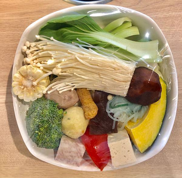 菜類很多,菜都很新鮮,高麗菜很甜、玉米也吃起來會爆汁,還有一些丸子跟甜不辣,還有新鮮蕃茄,煮在火鍋湯裡,還有木耳,花椰菜跟南瓜,南瓜好甜,花椰菜也很好吃,還有芋頭,我最愛吃的芋頭,很鬆,很甜,還有香菇,香菇很大朵,超級夠味。