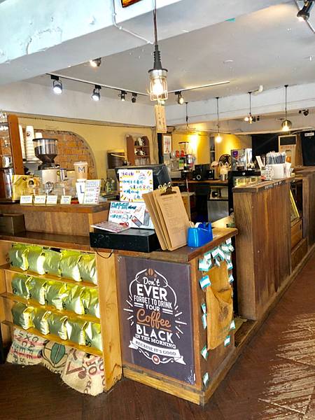 櫃檯與下面金色的袋子,裡面也滿滿的是咖啡豆。