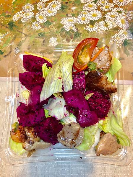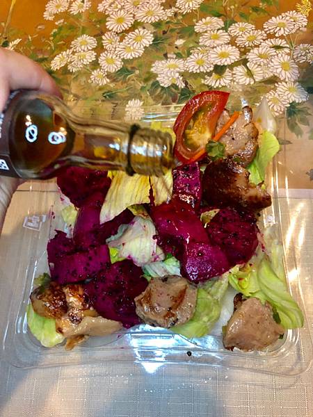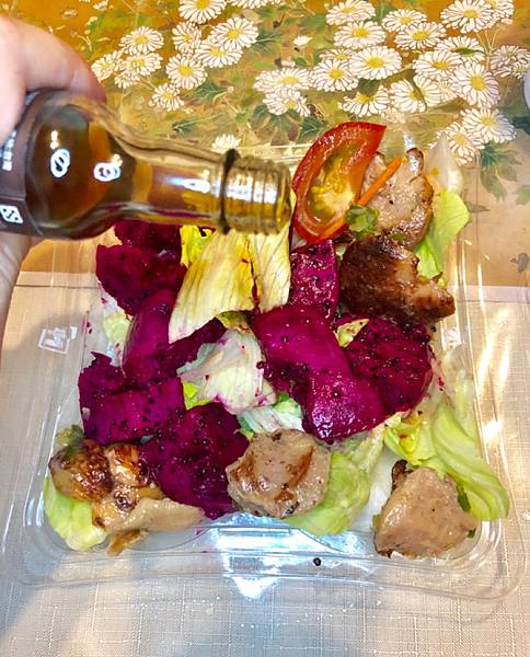 我的沙拉有菜也有肉及水果,加入了秋釀慢慢的咖啡醋,在加入的時候味道真的很香而且很開胃,我的沙拉拌入咖啡醋後,沙拉吃到的是菜與水果的天然甜味還有肉的味道,融合了醋的香氣,最後帶出咖啡的韻味,咖啡在嘴巴跟菜與水果及醋的合體,完全不會有違和感。