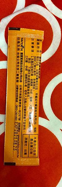 後面是黃橘色,黑色字體,一天只要一包搭配350CC的水來食用,請飯後食用。