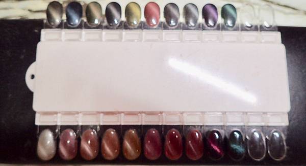 米兒拿出貓眼色卡,讓小編挑一款喜歡的感覺,小編一開始是挑暗色系,然後比在小編的指甲上不適合,最後小編挑一款比較偏向夏天的紫色帶點粉色系的單色指甲油,來做貓眼的變化。