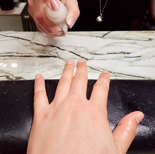 第一步先消毒、清潔,小編的指甲,噴消毒水。