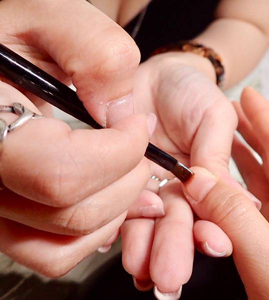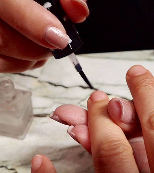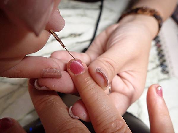 米兒細心的幫我上一層金色的線在指甲最前端。