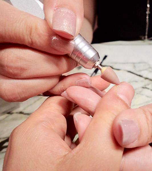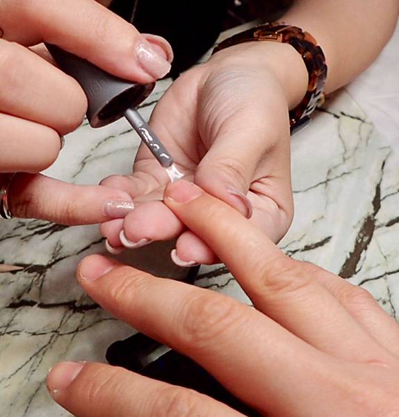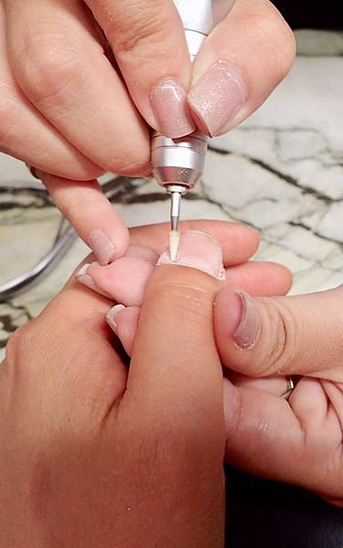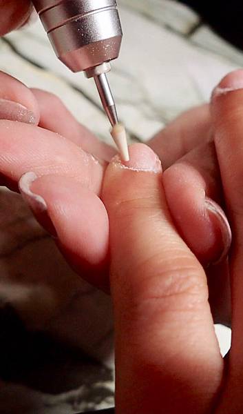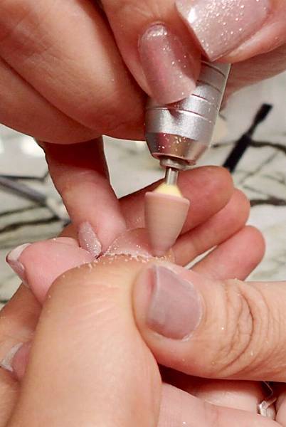 然後米兒在把那個像牙醫的工具,換上更細小的刀頭,繼續磨指甲,這個可以修補更細小的範圍。