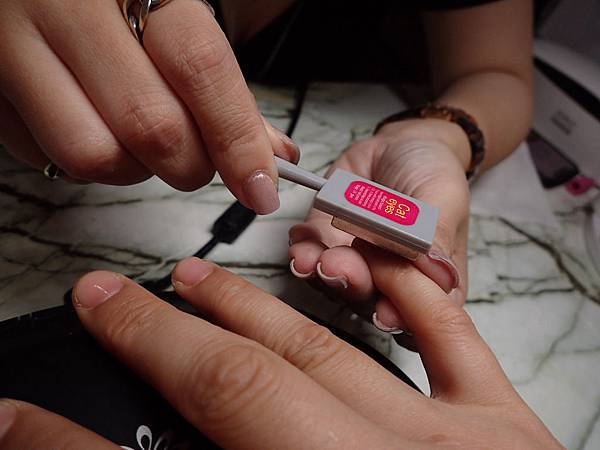 這個磨皮的機器用在手上指甲上,有種在給人家按摩的感覺,不會不舒服,也不會痛,小編感覺很舒服,一直注視著這台機器在小編的指甲上運作,真的是很特別的體驗,這也是小編的初體驗,美甲工具這麼好玩,(誤
