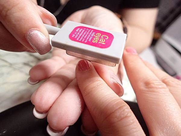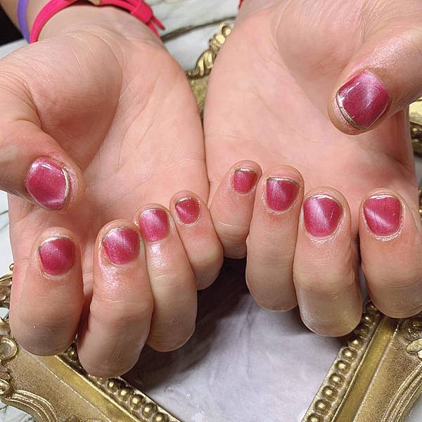 米兒看到小編的短指甲,一直跟小編我搖頭,說小編的指甲太短,包邊保護光療指甲都有困難了,很難做畫,只能用單色做變化,製造貓眼效果,然後上面在幫小編上一條金線,比較不單調。