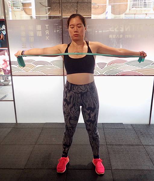 第二個訓練是用瑜伽常用的伸縮帶,來訓練小編的後背與前胸。