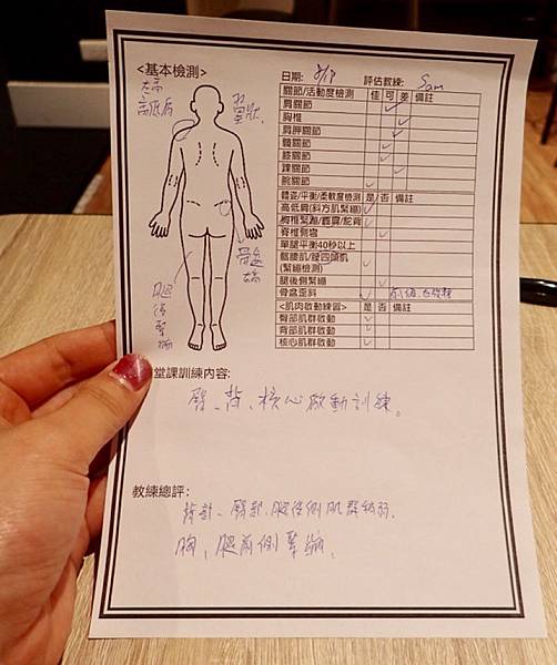 這個就是教練在評估與帶給客人規劃課程與想要達到的目標,還有妳身體現在的狀況。