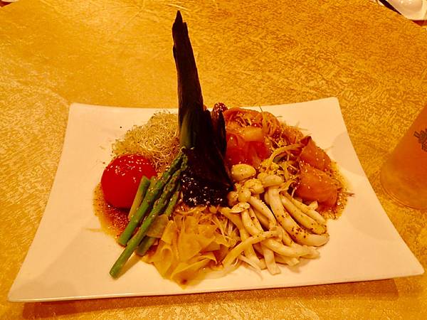 和風燻鮭沙拉,燻鮭魚好好吃,肉質甜美,新鮮,旁邊搭配的所有菜都可吃,菇也甜,番茄是整顆放上去的,番茄好甜!食材都好新鮮,還有百香果醃菜,酸甜好吃!還有海苔、蘆筍、苜蓿芽,都超級新鮮,甜!