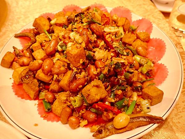 臭豆腐把它切小塊,拿去炸,酥嫩,利用哇沙米還有椒鹽做調味,搭配小魚乾,小魚乾也炸的酥脆,與花生,花生也不會太硬,小魚乾也超好吃,每一口都對味。