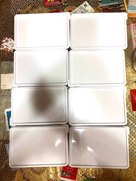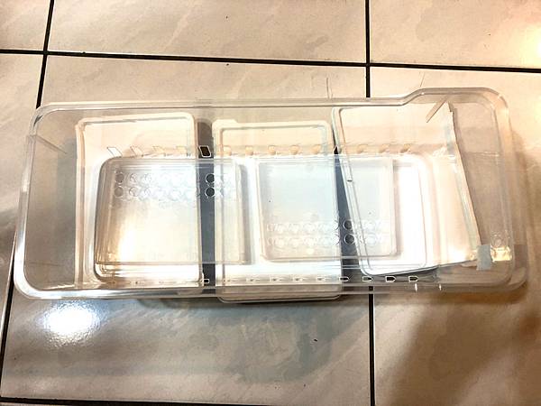 總共有一個大的沒蓋子的小方形,上面還有兩片有洞洞的透明版,還有兩個比較大的有蓋子的收納盒,兩組三個一裝,共六個小尺寸有蓋子的收納盒。