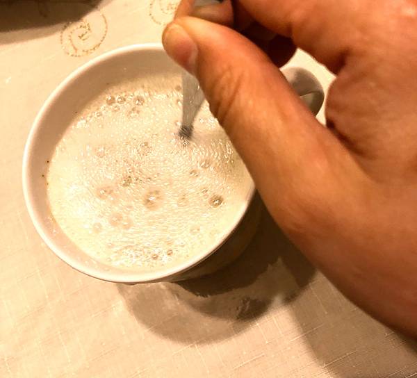 兩包都加入後,有沒有看到上面也有很多泡泡,這時要拿攪拌棒來,攪拌均勻。
