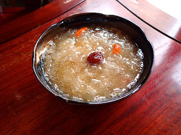 我看到菜單以為是飲品,但是送甜點上來時,發現是比較稠的,而且木耳很濃郁,有膠質,膠質很多,入口即化,入口也很順口,重點是不甜,還有配上枸杞還有紅棗,木耳搭配枸杞跟天然的紅棗,天然帶出木耳等膠質與紅棗的甜度,冰冰涼涼的超好吃,吃完真的會因為膠質變美唷!