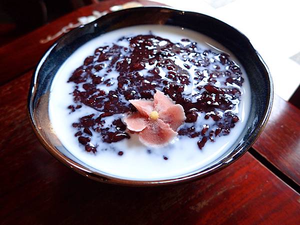 這一碗超綿密紫米紅豆粥本來是沒有加入牛奶的,客人買回去吃,店家會建議客人一定要加入牛奶,因為加入牛奶風味更佳,內用時也會幫客人加入牛奶,紫米很跟紅豆一起熬煮,紅豆跟紫米很搭配,店家把紫米跟紅豆一起熬煮,吃得到紫米也吃得到紅豆,但不會互相搶走風味,味道融合在一起,然後在搭配上一點牛奶,奶味也不會太重,旁邊還有用白豆沙做成的一朵小花,搭配紫米粥吃好好吃,味道也不會太甜,剛剛好!