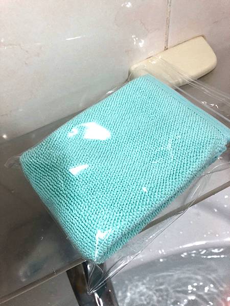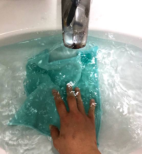 讓艾美肌鍺銀離子美容導入巾全部浸泡在溫水裡,稍微用乾一點就好,不要用到全乾,因為艾美肌鍺銀離子美容導入巾需要大量的水,