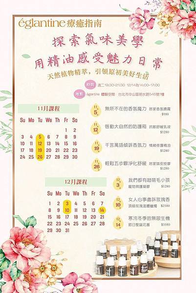 這是目前11-12月的課程,老師很棒唷!是專業的芳香療法認證老師, 如果喜歡芳香療法的朋友們,可以到églantine KNC亞太分公司的粉絲專頁報名,臉書搜尋:églantine大馬士革玫瑰莊園。