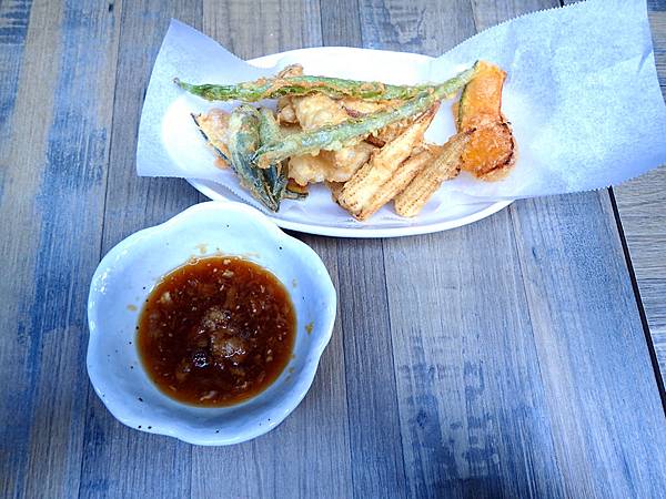 這裡面有五種蔬菜,有些我記得有些有忘了,但是都吃得到蔬菜的原味,麵衣沒有很厚,有玉米筍,玉米筍很甜,吃原味就吃得出他的甘甜了,但搭配日式醬汁,更顯得味道,酸酸甜甜的不會蓋過玉米筍的味道,在來是炸四季豆,四季豆單吃麵衣跟豆子也很好吃,四季豆不會太乾柴,還是有四季豆的原味,搭配醬汁吃也是,醬汁不會蓋過食物的原味,也不會太搶味,四季豆的原味配上醬汁酸酸甜甜超搭,還有地瓜,地瓜本身就很香甜,好吃!搭配醬汁也是一種美味,嘿嘿!剩下的就等你們自己來店裡走一遭了(其實是我忘了有什麼時蔬),但這也是一種神秘,你們親自來吃會更有感,怎樣的好吃!