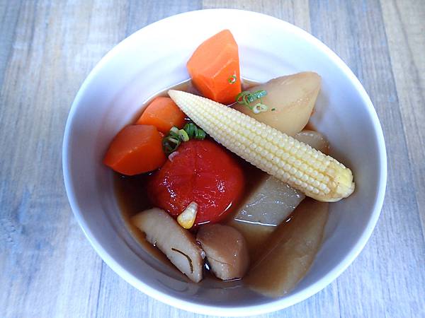 這一碗就是紅燒關東煮,這一碗也是素素的吧的招牌菜色,這一碗關東煮裡面有香菇、蒟蒻、白蘿蔔、番茄,這一碗裡的關東煮,食材都煮到入味了,食材也都很好入口,幾乎都是入口即化了,食材的味道也跟紅燒味結合,湯頭可以喝出中式的紅燒味道,但是還是會在湯頭裡隱藏了西式的香草,超特別,中西合併的這麼剛好,也不會互相不搭配,裡面還有老闆娘特製的中藥材包,這樣用心親自製作的好吃健康料理,真的超讚,味道真的也很濃郁,湯頭超好喝,食材也是新鮮到吃得出鮮味。