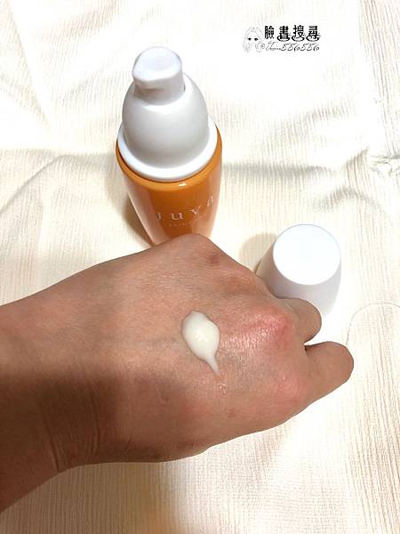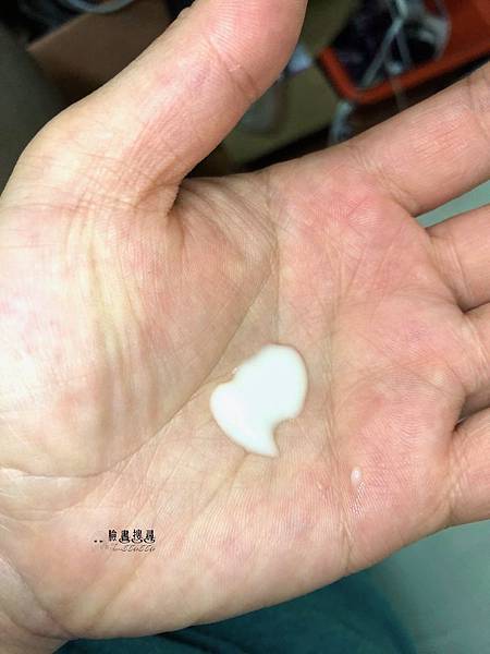 按壓在手上是白色的乳液,因為富含保濕成分,所以塗抹起來很水潤,還很容易吸收,而且推開馬上變成水狀,真的是超保濕的成分。